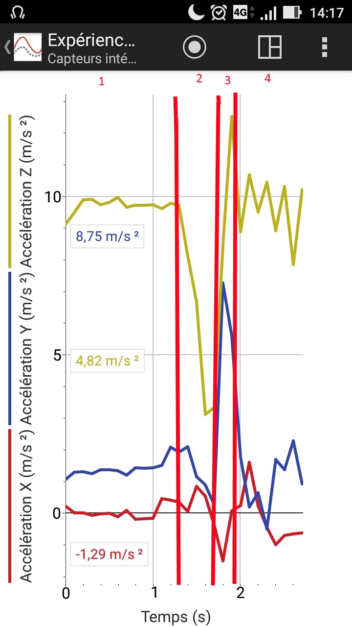 When we are on the chair we see the weight is normal. During the fall the weight is lower and when the fall is finished the weight is higher than the normal weight. Then it returns to an usual value.